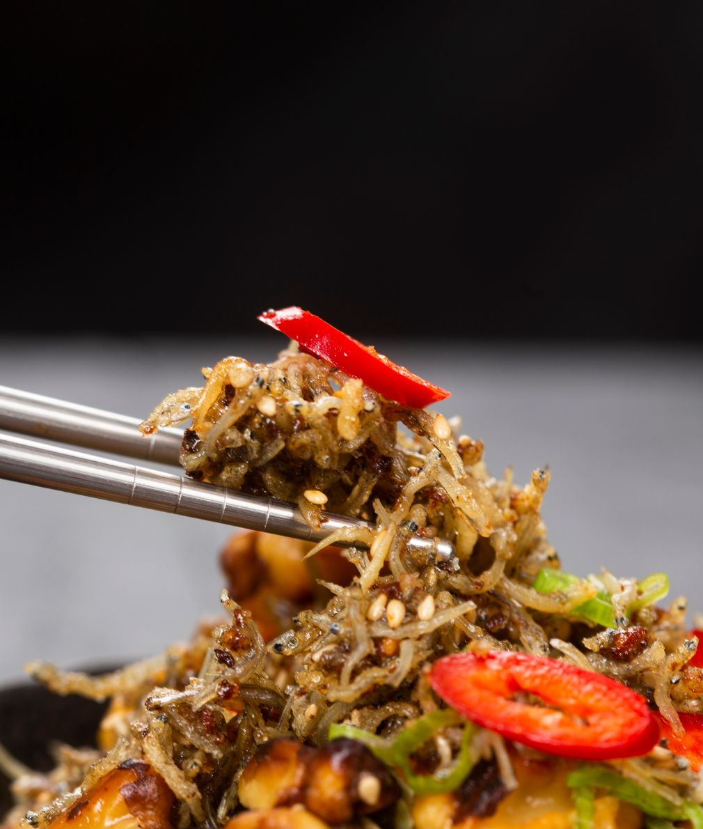 멸치볶음은 한국의 전통 반찬으로, 멸치를 달콤하고 짭조름하게 볶아 만든 음식입니다. 달콤함과 짭조름함이 어우러지고, 찐득하면서도 바삭한 식감이 특징입니다.